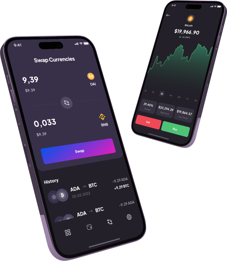 Our multicoin wallet app supports the main blockchains within the Ethereum ecosystem, and works with any ERC20, BEP2 and ERC721 tokens whilst also providing coverage as a Bitcoin Wallet.